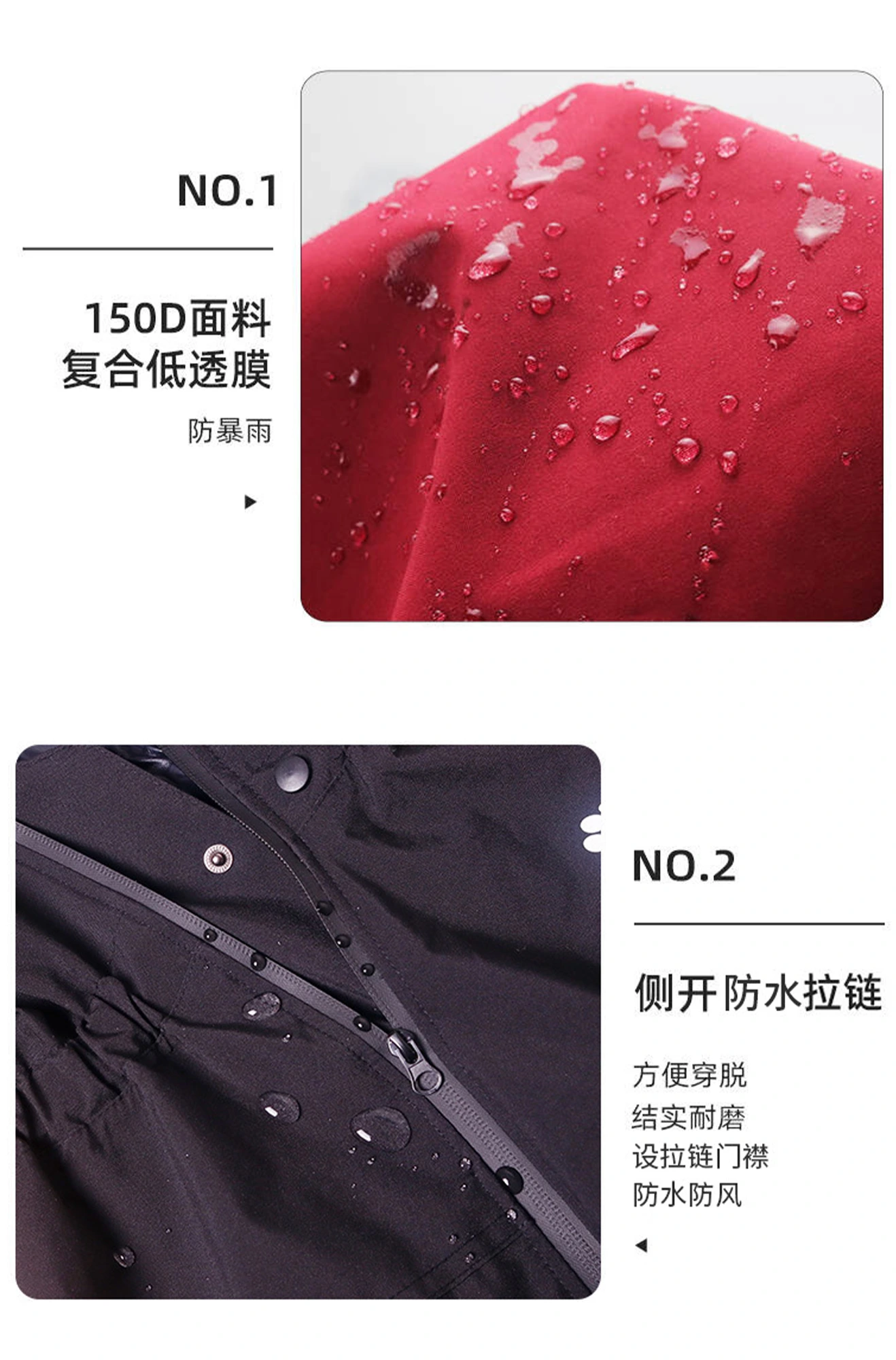 | •全身热压防水胶条,全方位锁水不渗漏 •背部预留牵引孔,透明帽檐儿,帽子可拆卸 •袖口弹力可调节设计,贴合不勒腿,活动更自在 •侧边防水拉链 + 颈部纽扣设计,穿脱快速,不易挣脱 •实测速干性能:21℃环境下,15–20 分钟即可快速干爽 |
