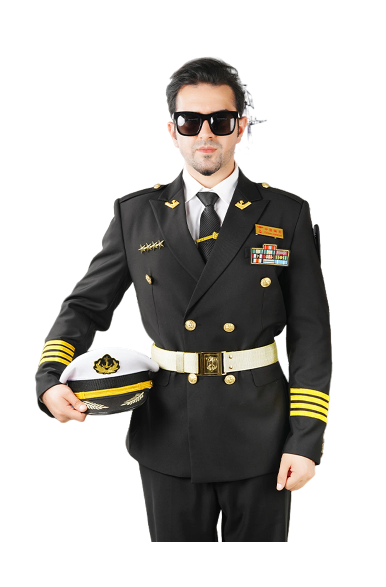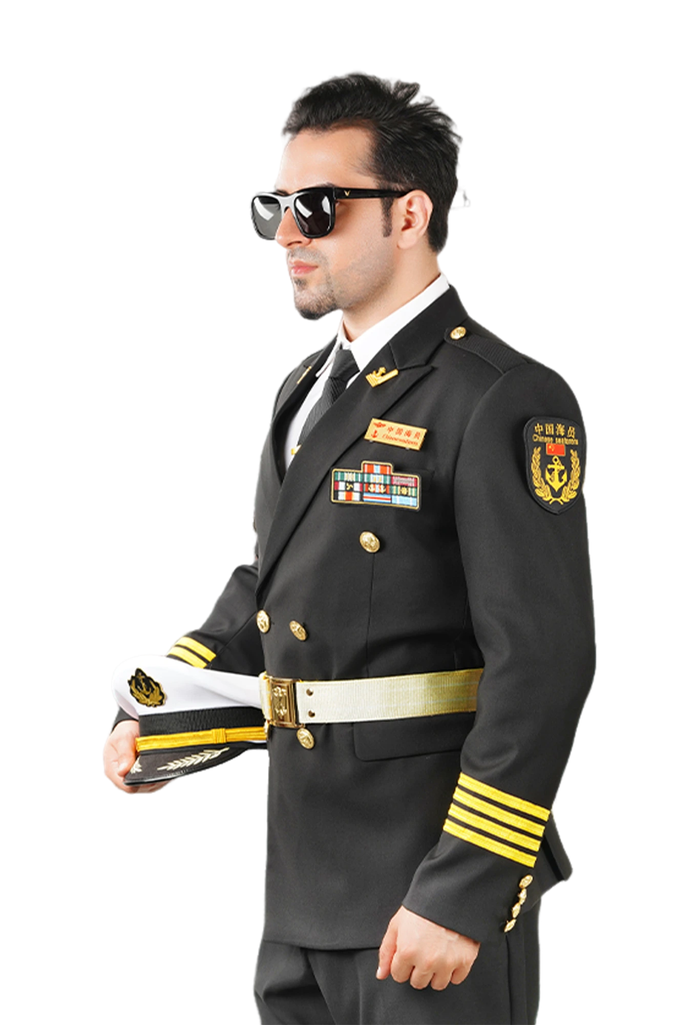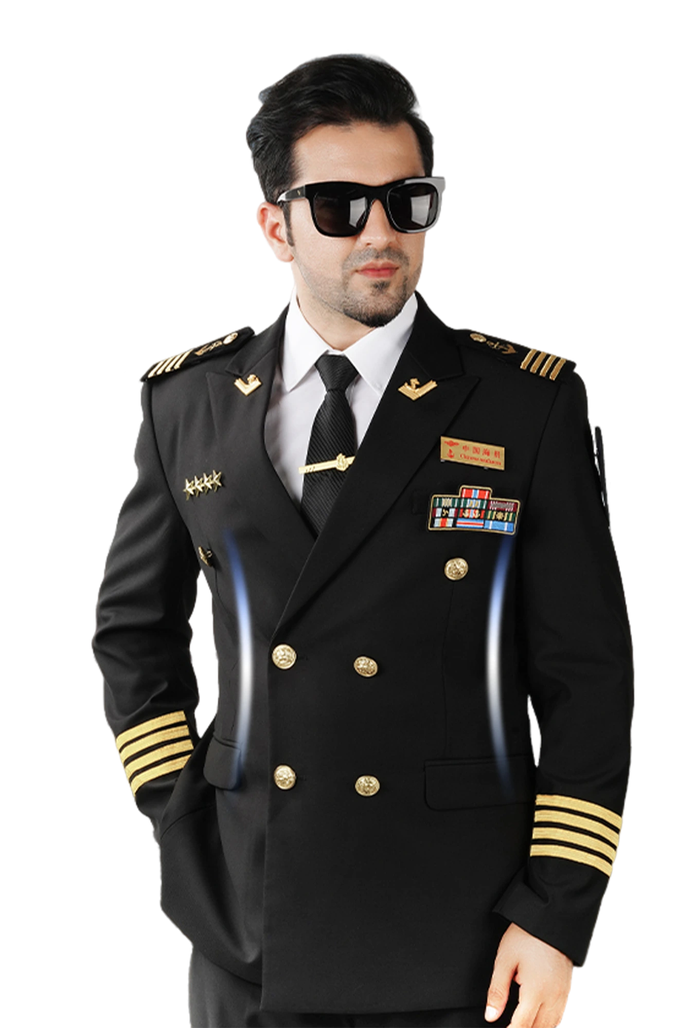 经典双排扣海员制服,3D立体裁剪版型舒适挺括;仿毛哔叽面料材质不起皱、不起球、简易搭理;进口印度金丝织带、金属纽扣彰显工艺质感;